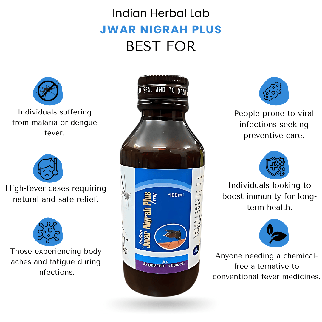Jwar Nigrah Plus is a 100% herbal formulation designed to combat fever-related conditions like malaria and dengue. Crafted with time-tested Ayurvedic ingredients such as Neem, Giloy, Tulsi, Kutki, Amla, Dhaniya, Harar, Bahera, Peepal, and Kali Mirch, this syrup strengthens immunity, helps reduce high fever, and accelerates recovery from infections. It offers a natural solution without side effects, ensuring effective relief with every dose.